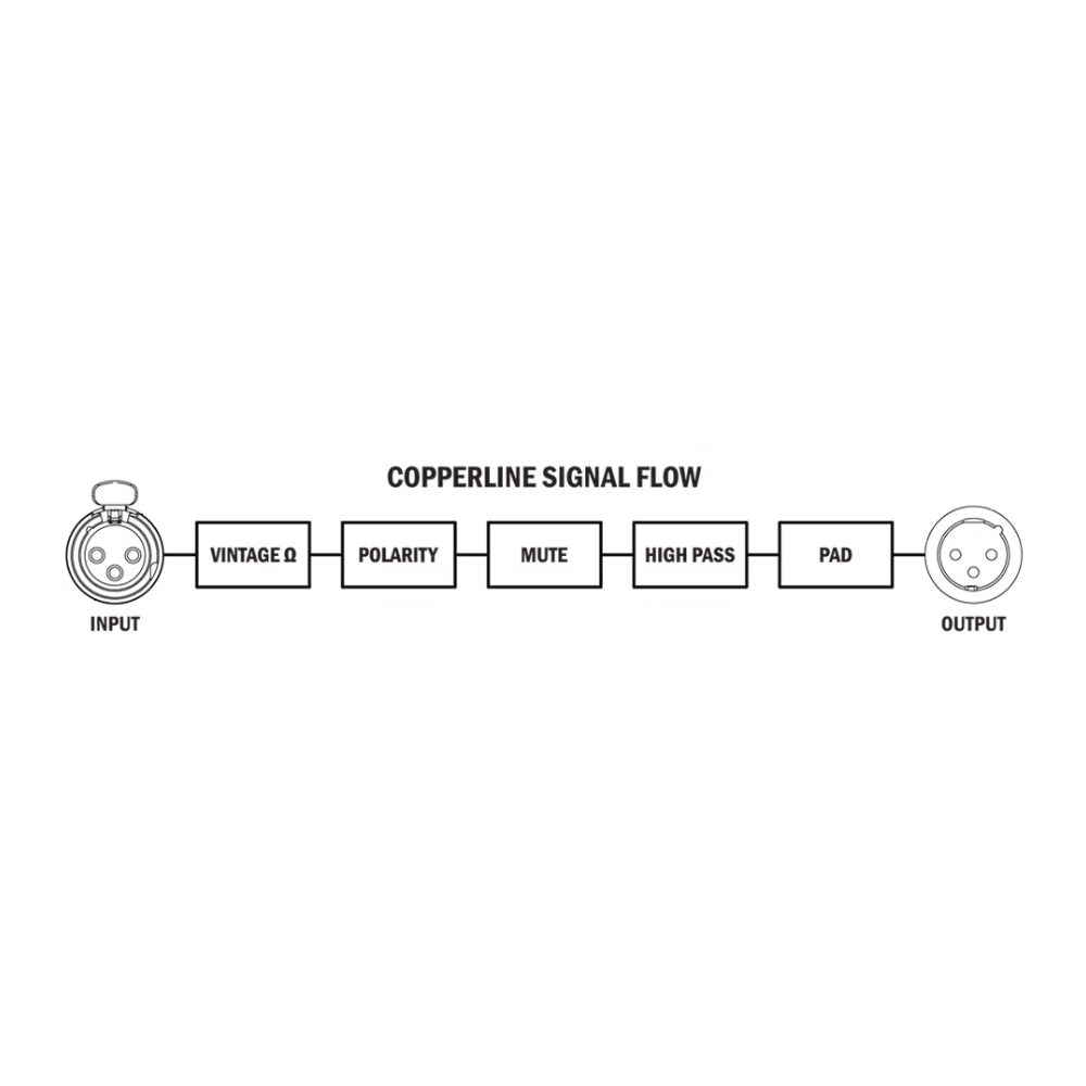 Want to load down the signal of the device (mic or line level) connected to the input of the Copperline? The ‘Vintage Ω’ or ‘Vintage Load’ switch places an 825 ohm resistor across pin 2 and pin 3 of the input XLR. This can be useful when the input impedance of the device connected to the output of the Copperline is high. Some microphones or line-level devices actually sound better with a heavier/lower Ω load. We know that some vintage preamps, compressors, and EQs actually require a 600-ohm load to sound “correct.” With the Vintage Ω Switch, you can easily plug in a unit requiring a 600 Ω load, then easily A/B between the two different loading impedances.