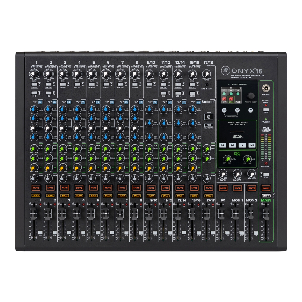 Packed with modern workflow enhancements, the Onyx16 features a powerful built-in FX engine, Bluetooth® streaming, and Mackie’s Studio Command system with a full-color LCD and one-knob control. Add in direct stereo SD card recording, rugged steel chassis design, and a software bundle including Waveform OEM and the DAW Essentials Collection™, and you have a versatile mixer that blends classic analog warmth with the convenience of today’s digital technology.