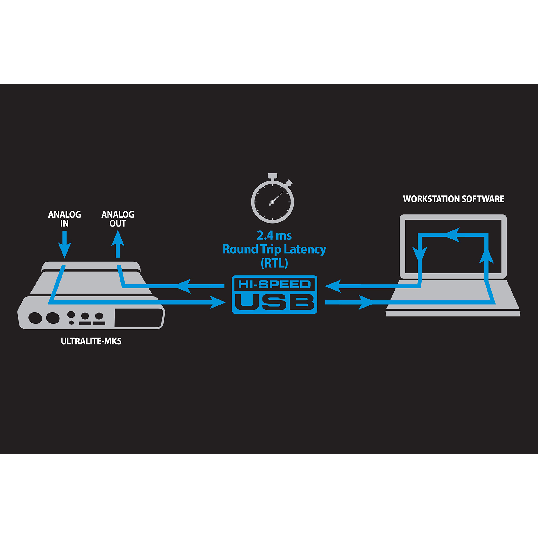 Optimized drivers for both Mac and PC deliver ultra-low latency performance. With a high-performance DAW such as Digital Performer, the UltraLite-mk5 delivers an astonishing round trip latency (RTL) of 2.4 ms (milliseconds) over USB (at 96 kHz with a 32-sample host buffer)