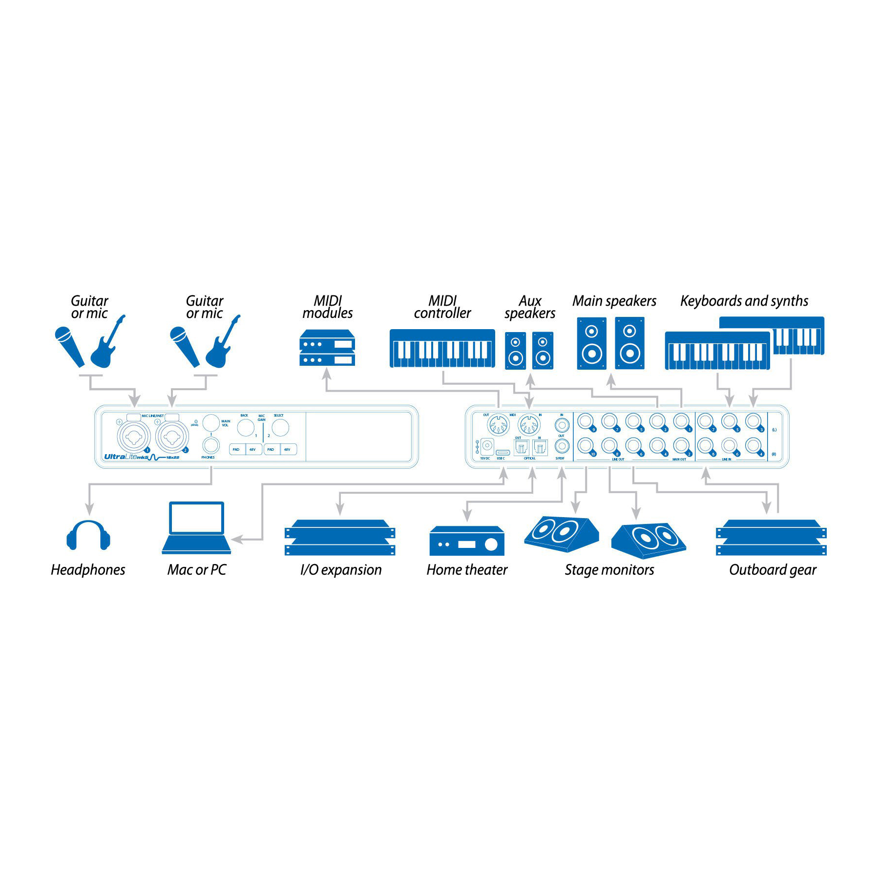 Housed in a compact, steel enclosure you can take anywhere, the UltraLite-mk5 is equally well-suited for studio and stage, with or without a computer. Connect all your personal studio gear for state-of-the art computer-based recording and production, or take it to your next gig to mix live, without a computer.